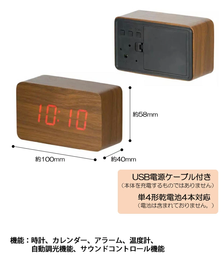 ウッド調LEDクロック/取り扱い説明書/USB電源ケーブル(本体を充電するものではありません)