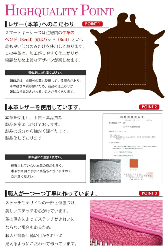 職人の手による縫製で作りが丁寧なほか、キー本体の出し入れがしやすいように、3面が開くジッパーを採用。