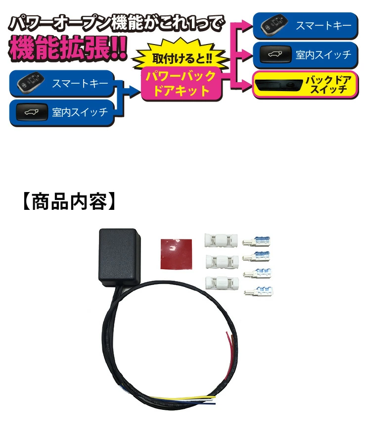 せっかくのバックドア自動開閉機能を、スマートキーと車内スイッチだけでなくバックドアスイッチからでも使えるようにするキットです。