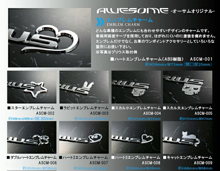 エンブレムチャーム 全20種類 どんな車種にも合わせやすいエンブレムチャーム プリウス・アクア・アルファード・ヴェルファイアにも バイク カー用品 【AWESOME/オーサム】 メーカー/ロゴ/マーク/ドレスアップ/飾り